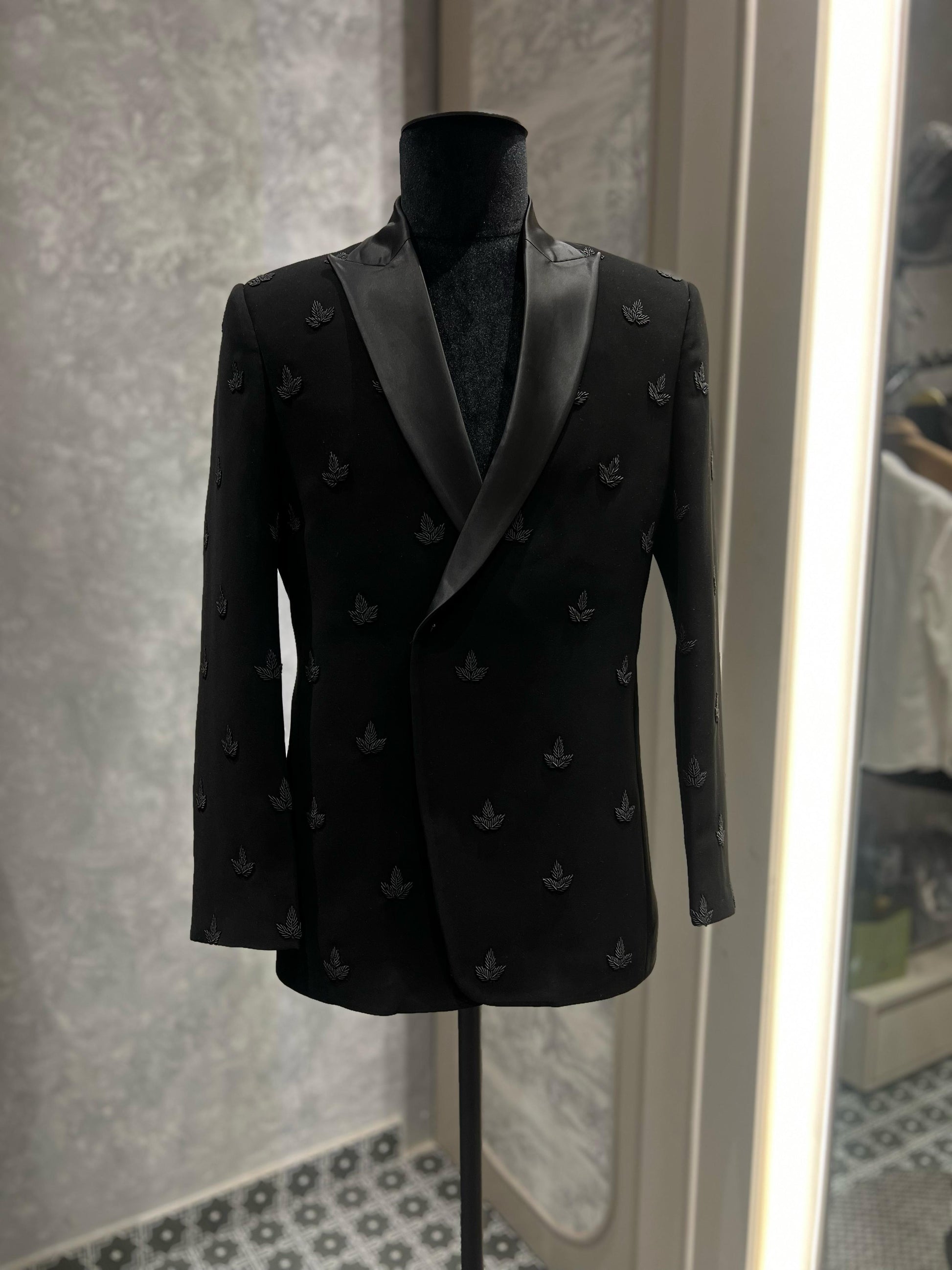 Where darkness meets elegance. The Royal Ember tuxedo is an indulgent, nature-inspired masterpiece crafted in Japanese luxe fabric. Featuring delicate hand-embroidered leaf motifs all over a classic black canvas, this piece redefines cocktail and festive dressing with understated royalty.