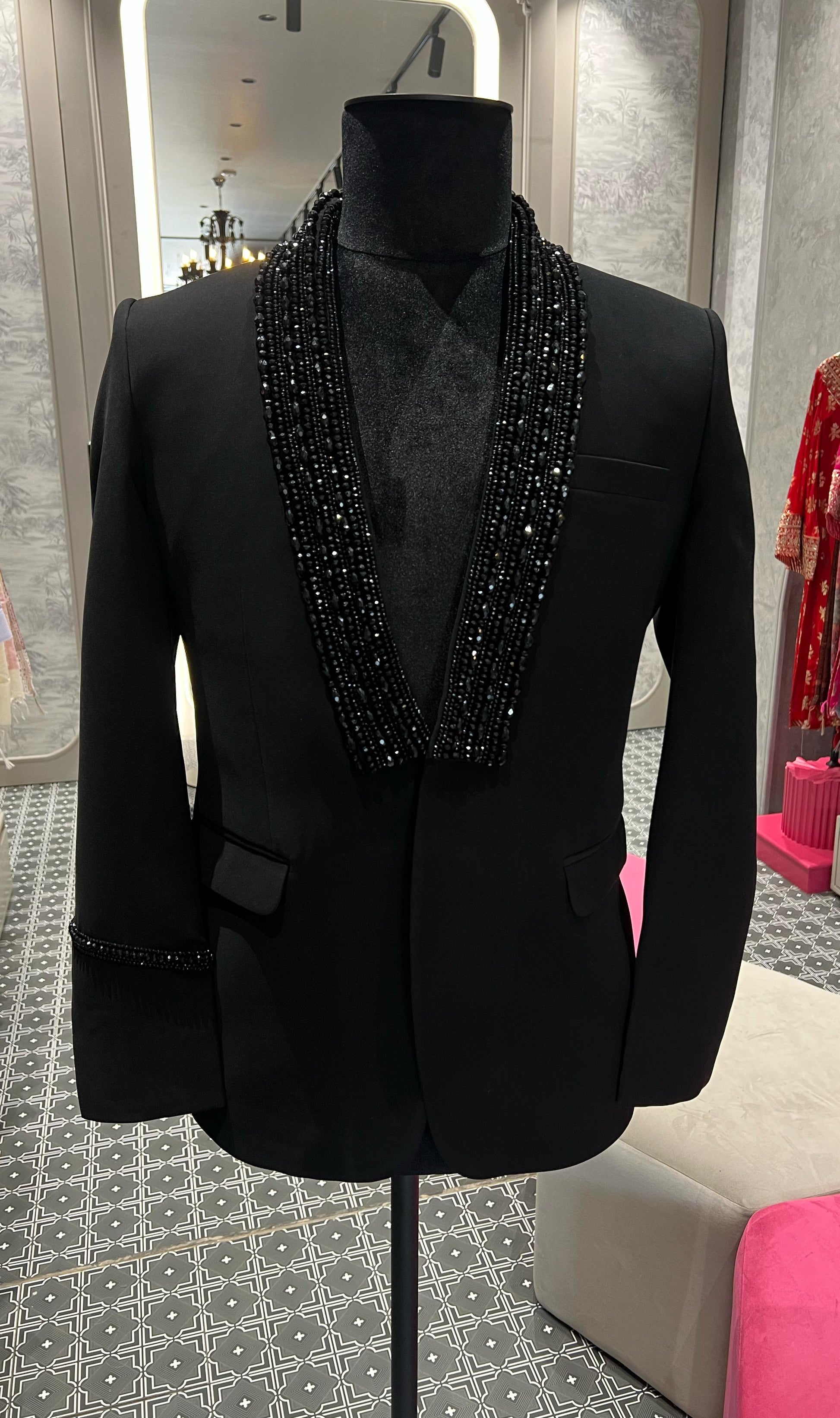 Channel timeless elegance with Shahi Blackout — an impeccable blend of royal craftsmanship and modern tailoring. Designed in rich black fabric, this tuxedo boasts a statement heavy embroidered collar, making it a perfect piece for cocktail nights, receptions, and high-profile celebrations.